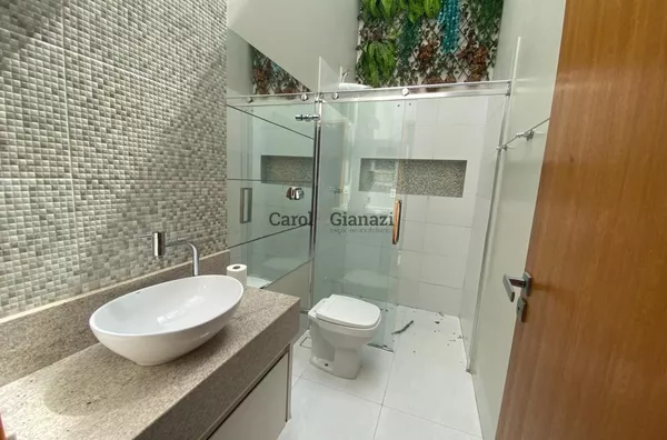 Banheiro social com box de blindex e gabinete planejado